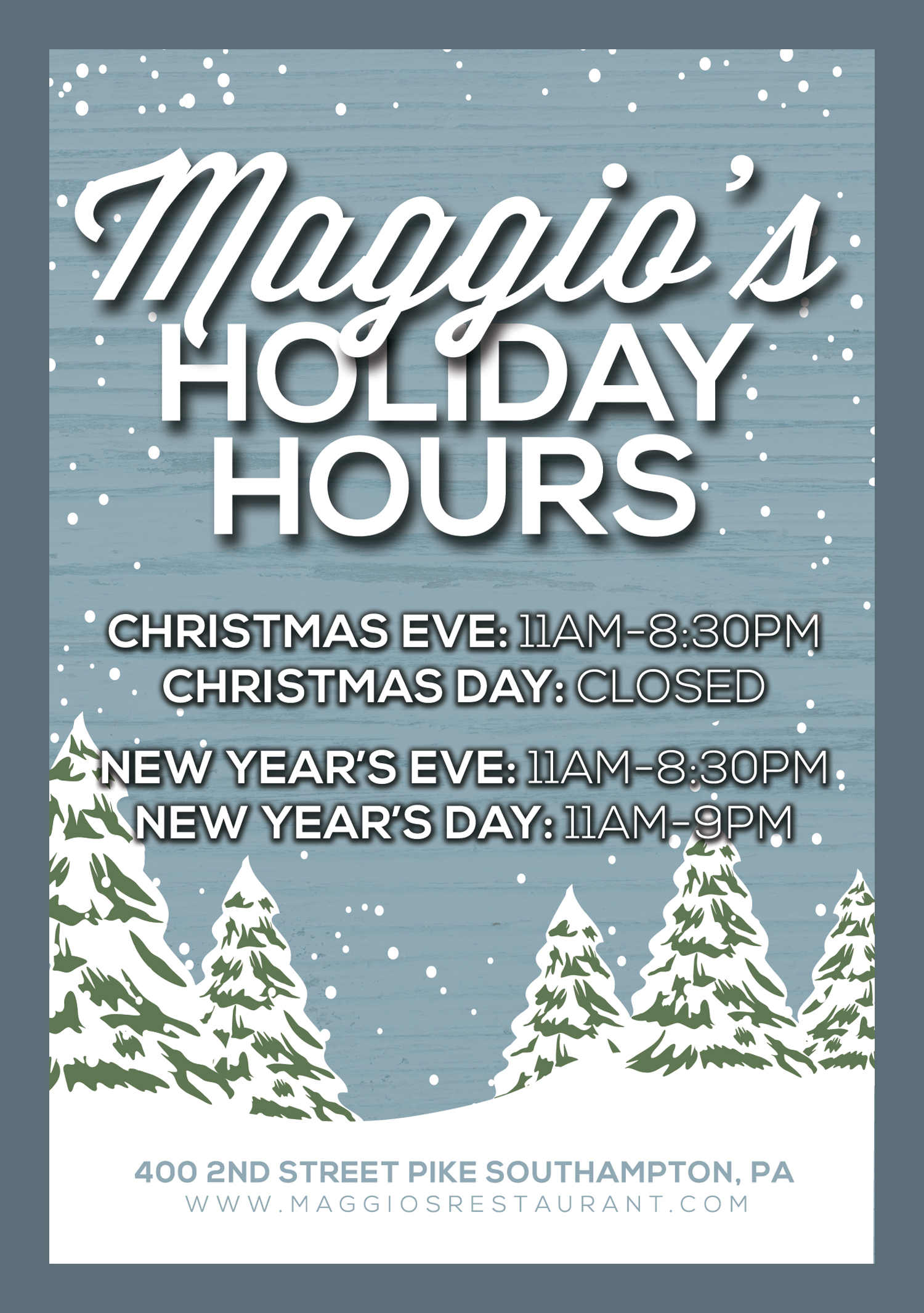 Restaurant Specials Order by Friday, December 19th Christmas Takeout Menus Thursday, December 25th Closed on Christmas Day All Month of December No Peeking!!! All Month of December Breakfast Specials