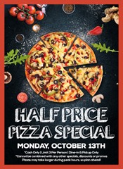 Restaurant Specials Monday, October 13th Half Price Pizza Special Sunday, October 19th Toy Story Brunch in The Ballroom Sunday, November 2nd Disney Princess Brunch at Brookside Manor All Month of October Breakfast Specials